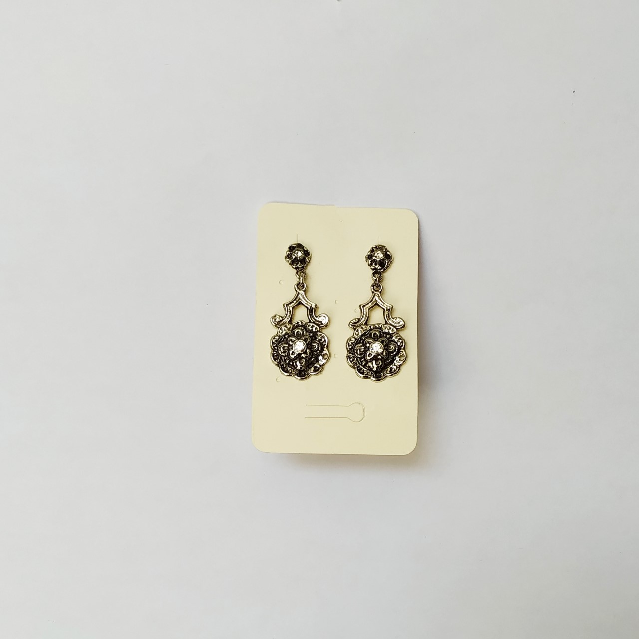 Pendientes plateados con detalles de piedras en color blanco, el cierre es con tuerca. Perfectos para los distintos trajes regionales, como el de serrana o espigadora.