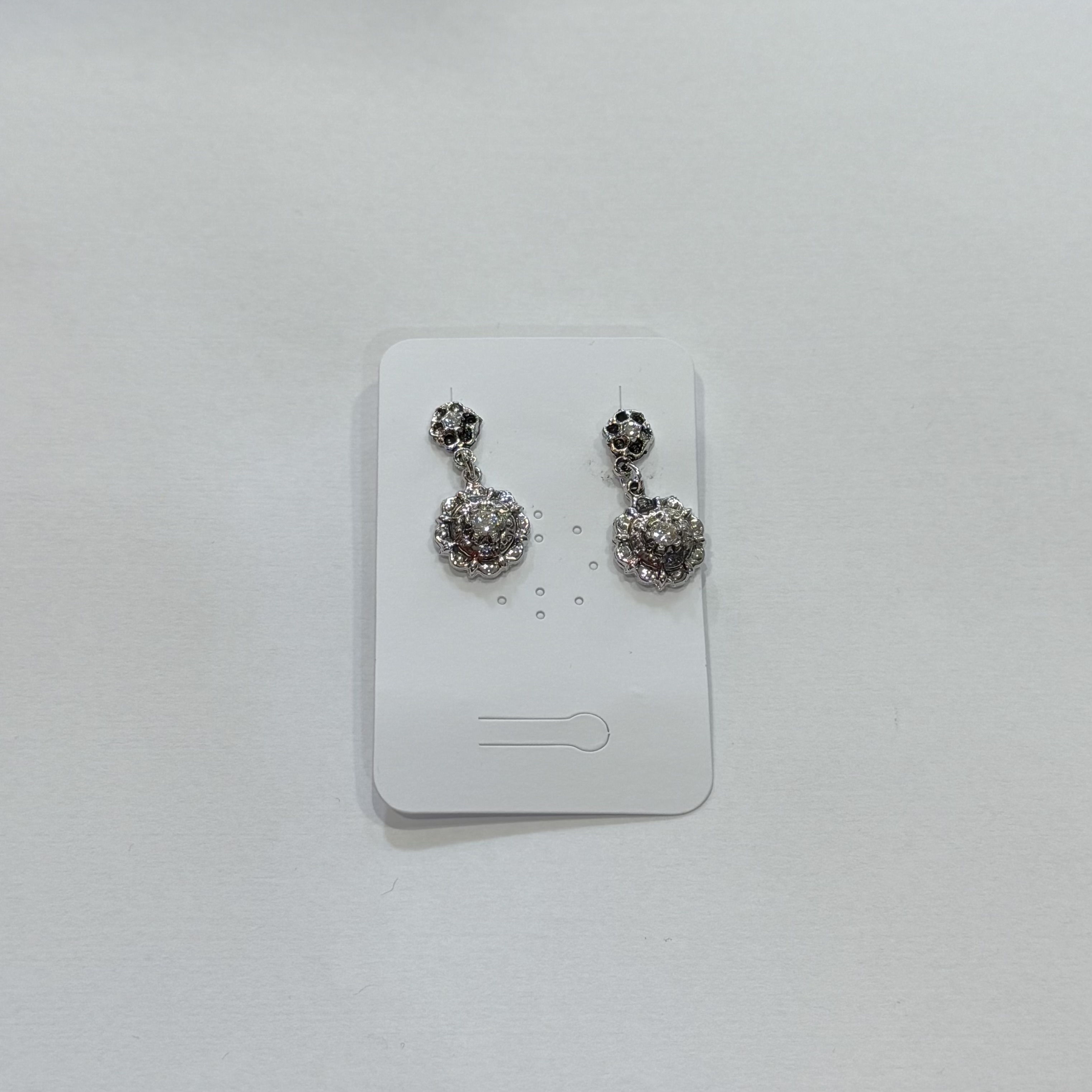 Pendientes plateados con detalles de piedras en color blanco, el cierre es con tuerca. Perfectos para los distintos trajes regionales, como el de serrana o espigadora.