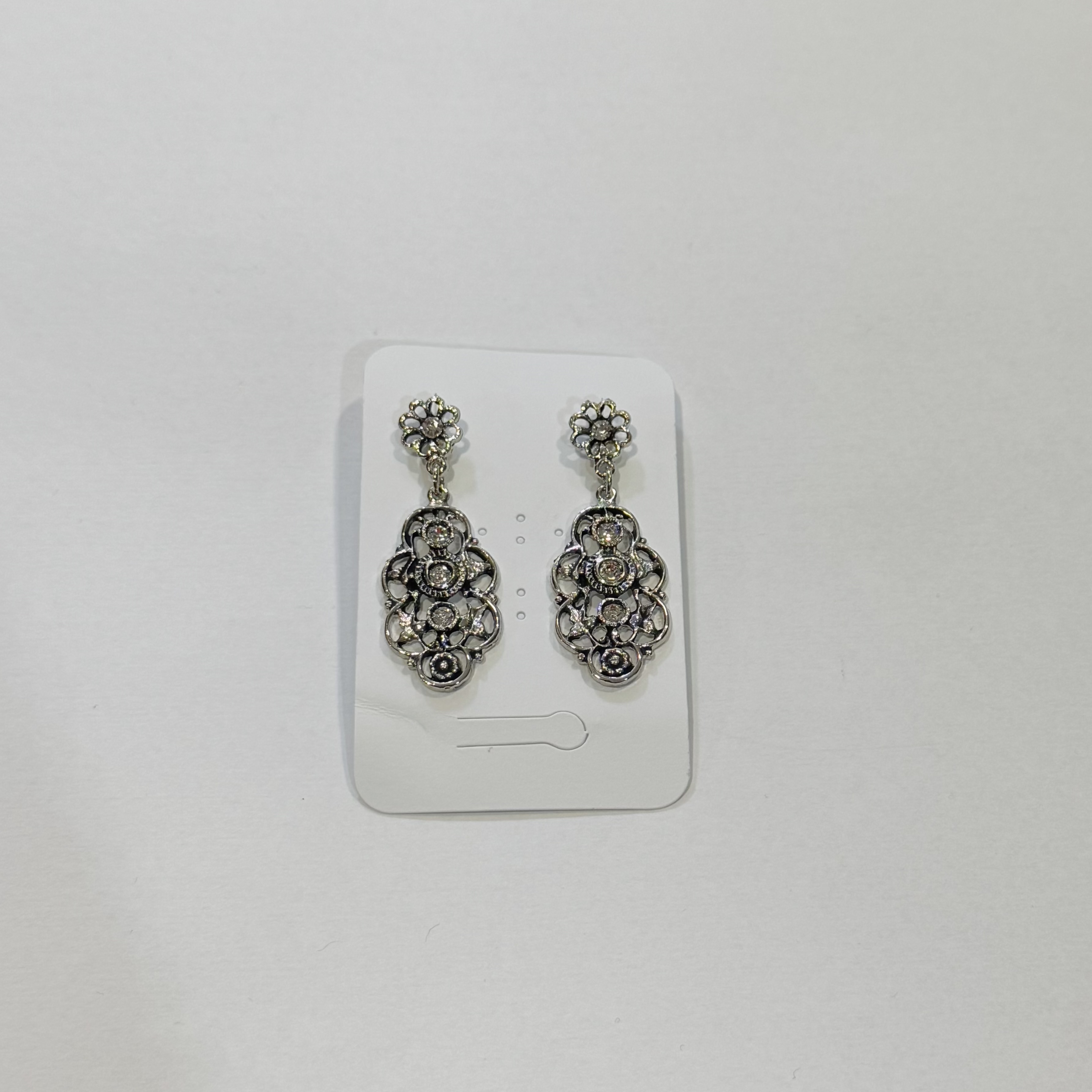 Pendientes plateados con detalles de piedras en color blanco, el cierre es con tuerca. Perfectos para los distintos trajes regionales, como el de serrana o espigadora.