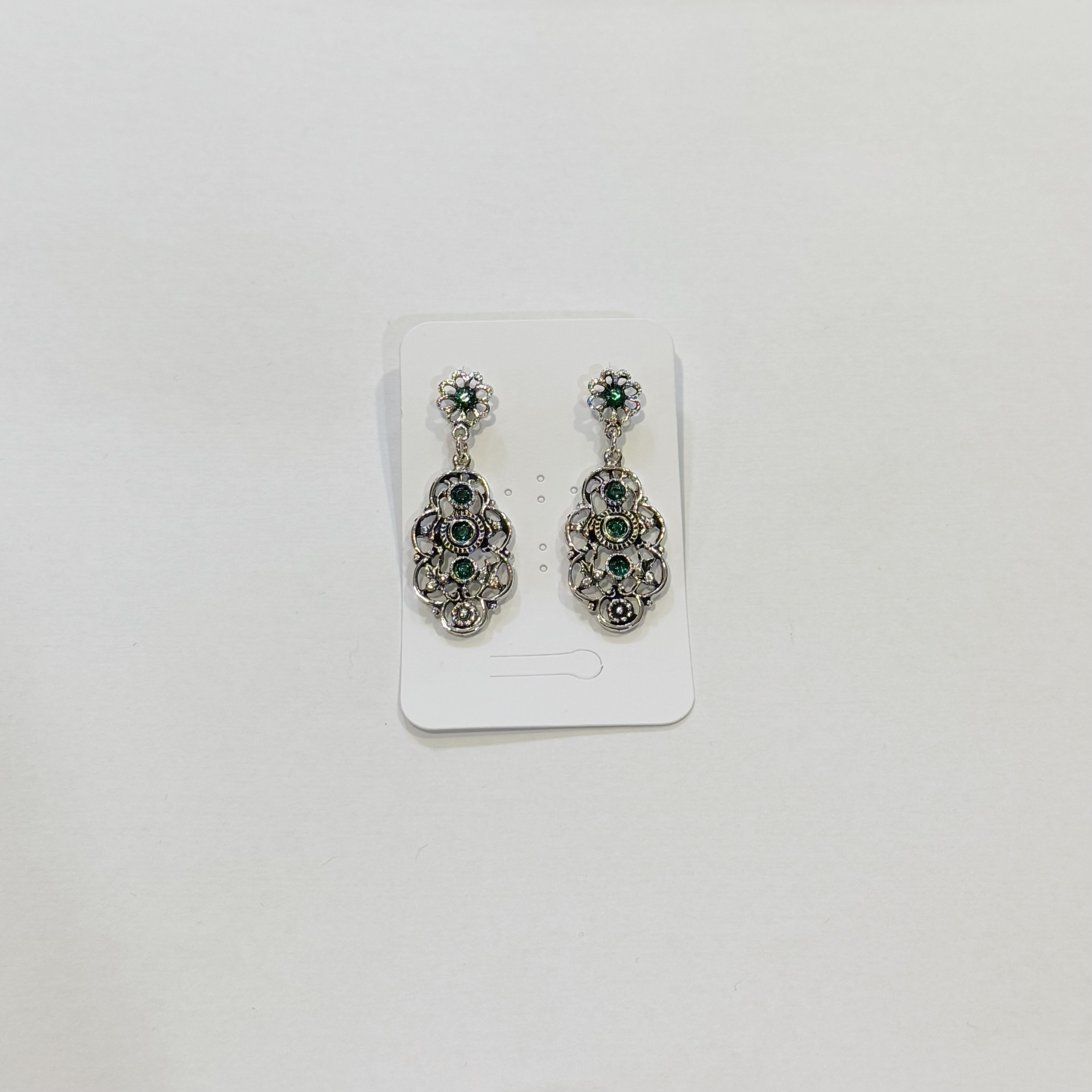 Pendientes plateados con detalles de piedras en color verde, el cierre es con tuerca. Perfectos para los distintos trajes regionales, como el de serrana o espigadora.