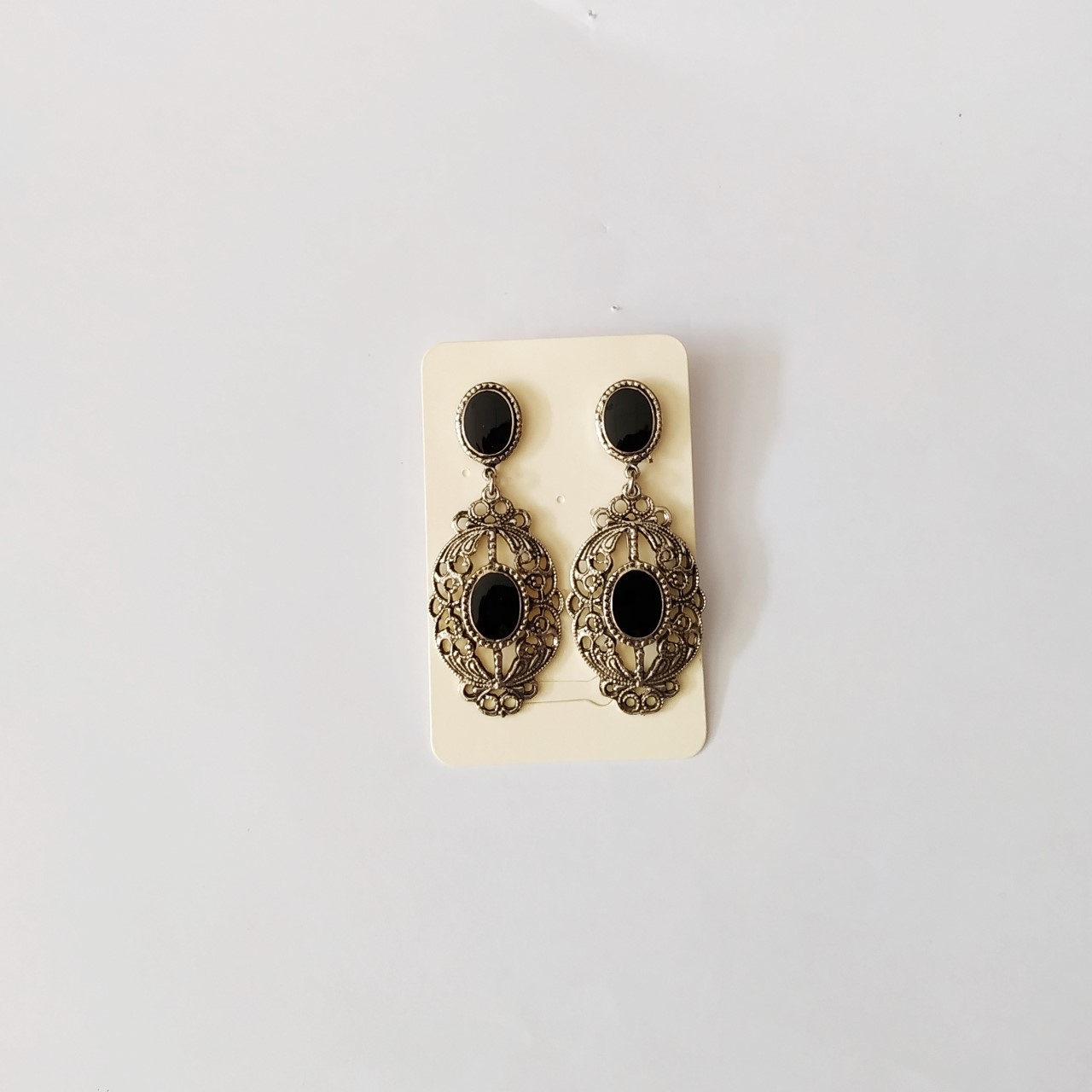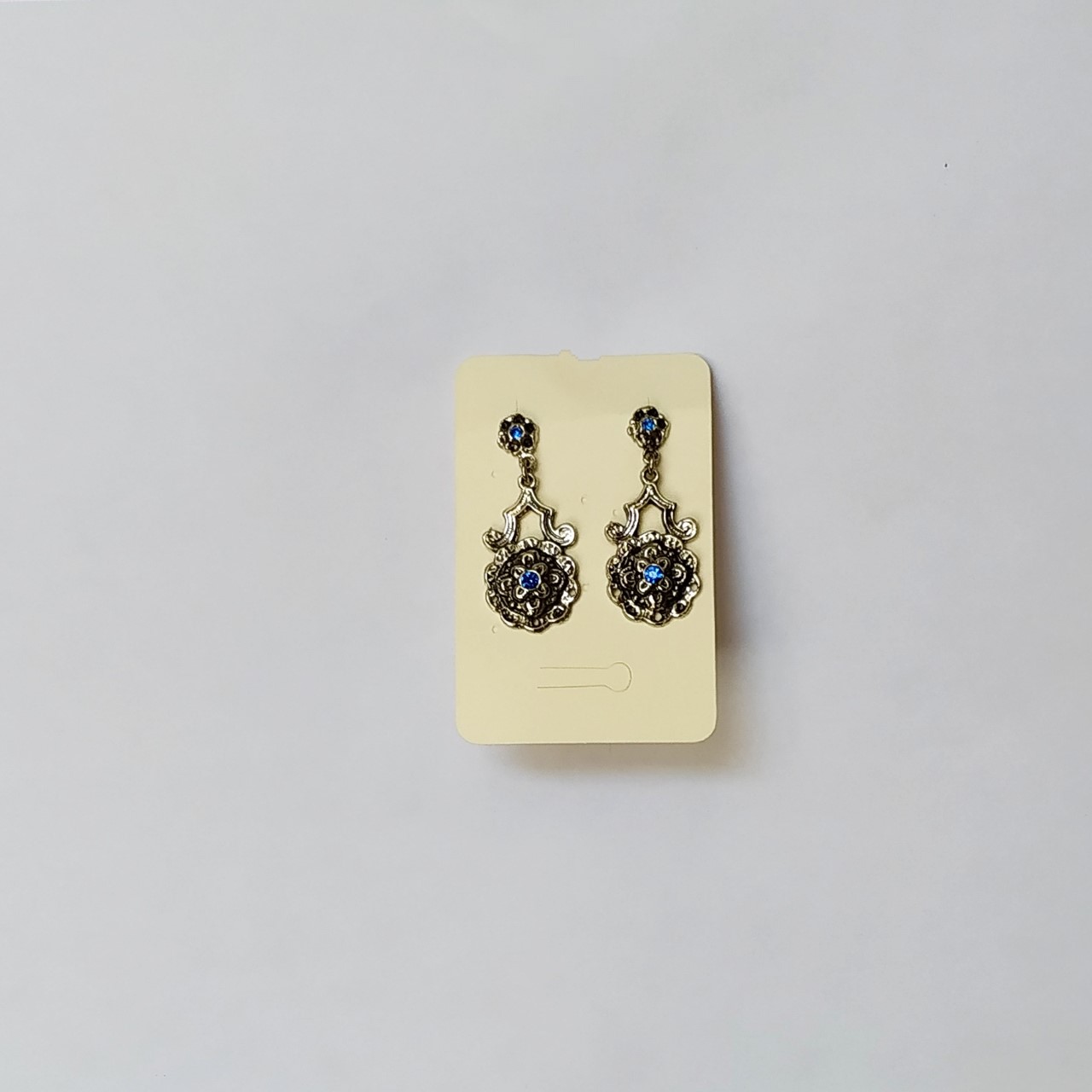 Pendientes plateados con detalles de piedras en color azul, el cierre es con tuerca. Perfectos para los distintos trajes regionales, como el de serrana o espigadora.